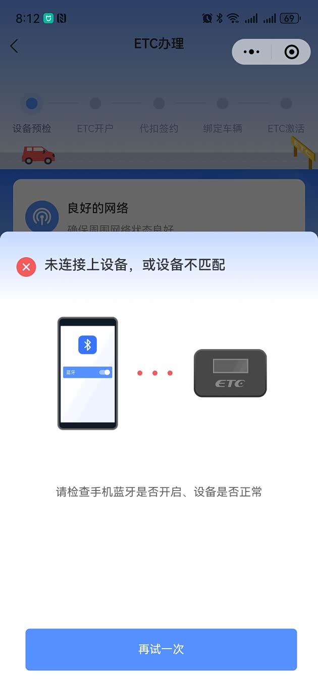 各位前辈:ETC和手机可以配对,ETC提示音:蓝牙已连接,但是手机只显示配对,不显示链接,打开微信小程序操作显示链接不上,求告知如何处理,谢谢🙏