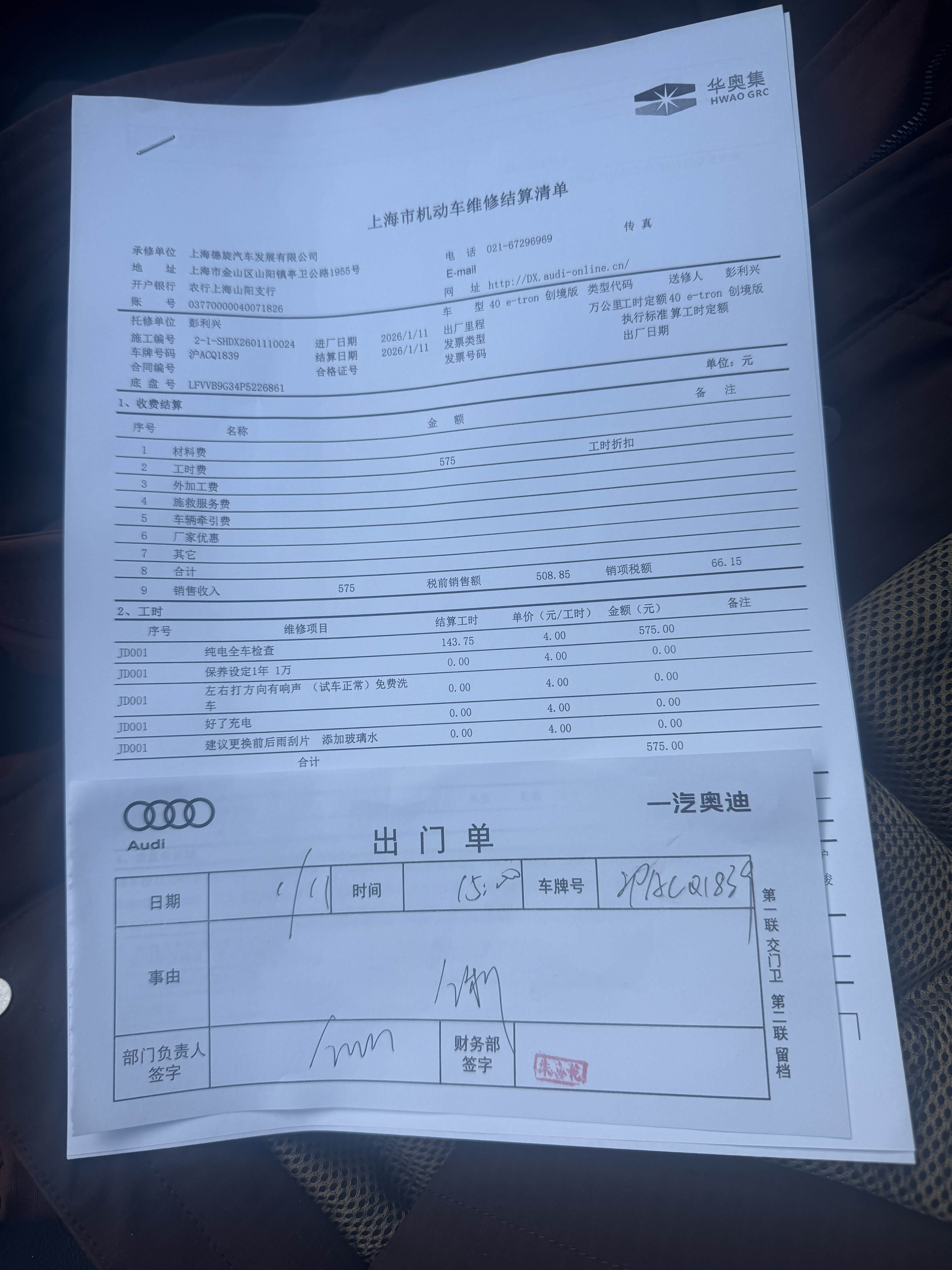1. 总费用: 575元(为纯电全车检查、空调滤清洁等项目的工时及辅料费用)