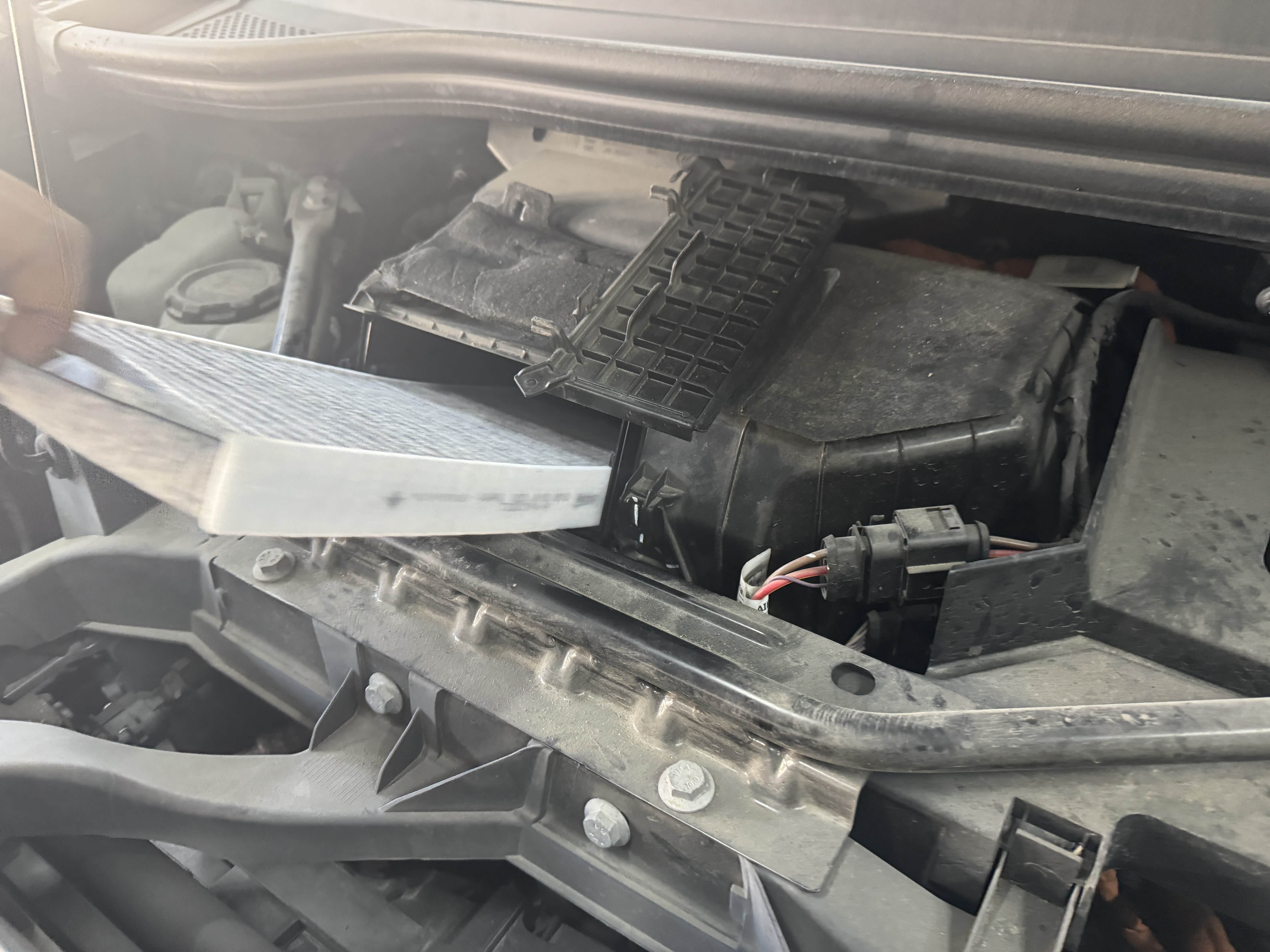 操作过程: 解决了异响小顾虑后,技师开始检查空调滤清器的状态。他先是走到副驾驶一侧,蹲下身来拆卸副驾驶脚部空间的空调滤芯盖板,用十字螺丝刀轻轻拧开盖板上的固定螺丝,动作轻柔又熟练,生怕损坏卡扣。掀开盖板后,空调滤芯的盒子暴露出来,当技师把滤芯抽出来的那一刻,我凑过去一看,发现滤芯其实还算干净,只是表面附着了少量浮灰,并没有树叶残渣、絮状物这些脏东西。