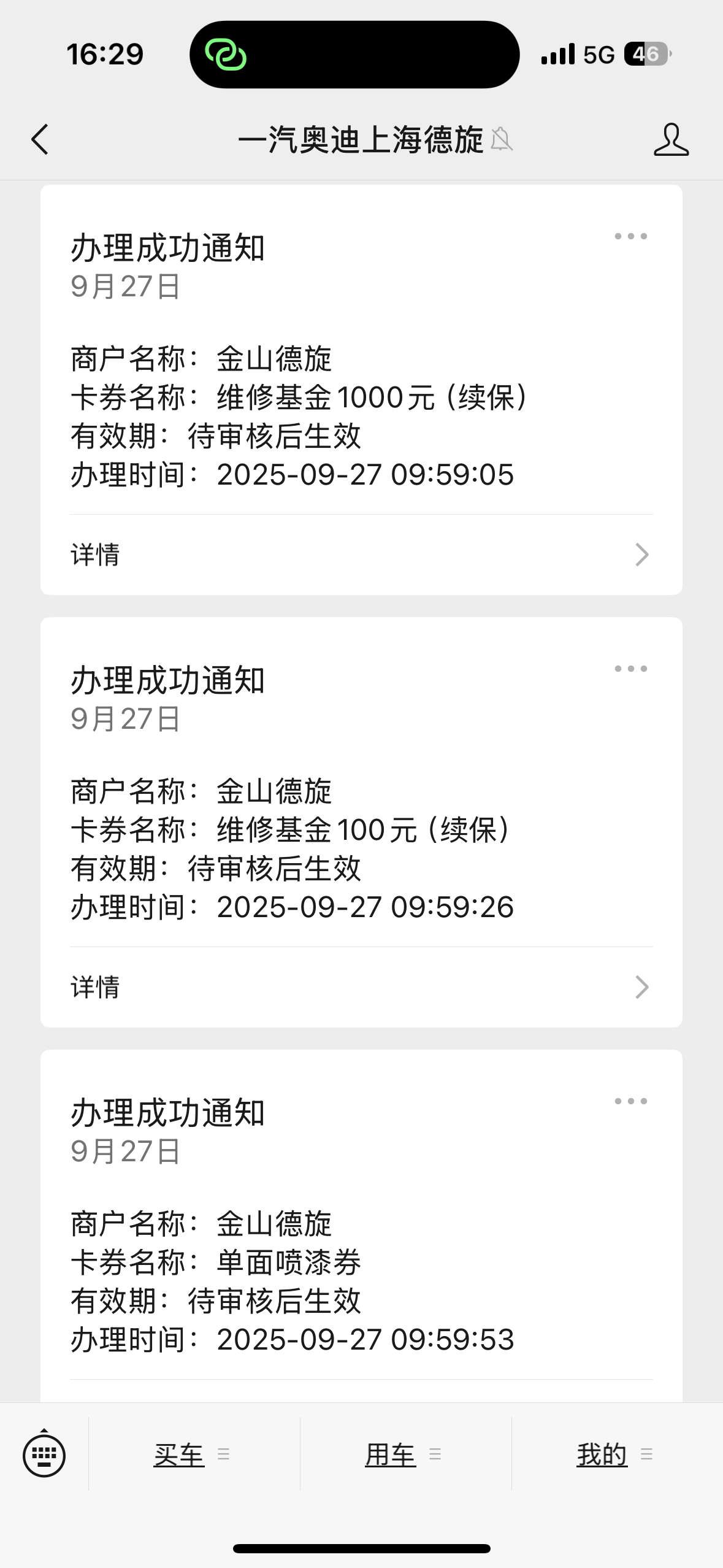 2. 支付方式: 用奥迪4S店买保险时赠送的1100元保养券全额抵扣,实际零花费,券内还剩余525元可用于下次保养。