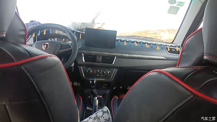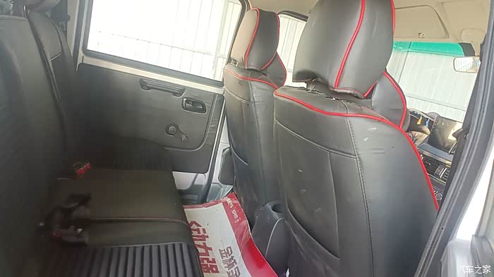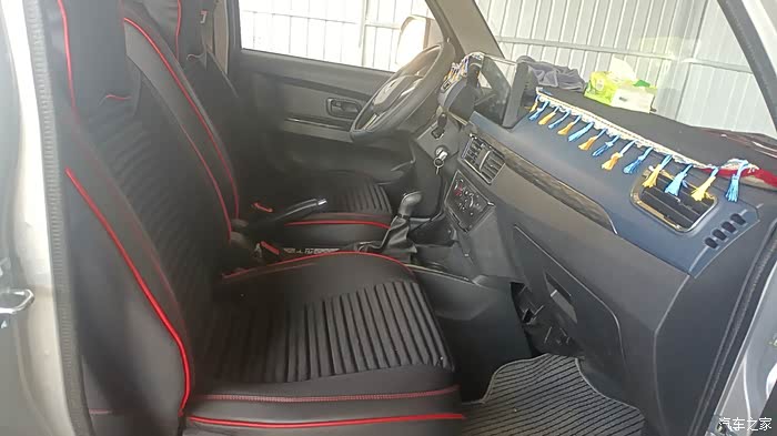 说,这个油耗还可以接受。内饰的颜色是黑灰色的,用料不是很高档,不过做工看上去还不错,主要是比较简约,车内异味还不算大,刚买新车的时候有点味道,开了几天通风之后就没有什么味道了。舒适性的话感觉座椅有一点偏硬,我自己装了一套坐垫,坐上去软很多,隔音效还可,毕竟是一台货车也不可能像轿车那么安静。我以前的车没有电子助力开起来特别累,所以买新车的话我最注重的就是电子助力,另外我加装了一个导航和倒车影像很实用。