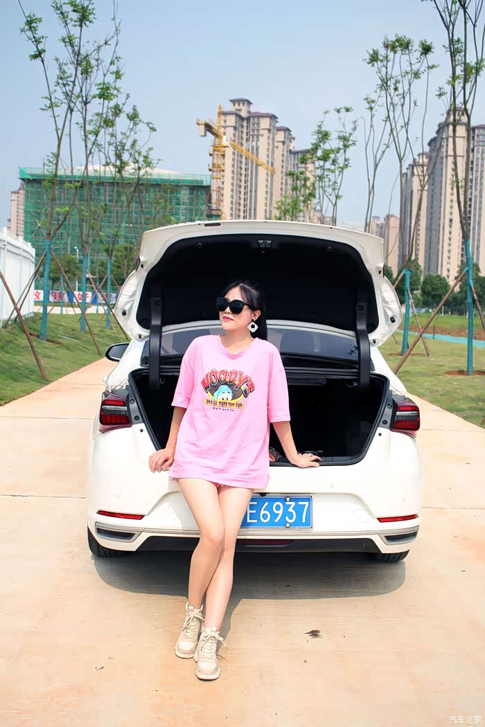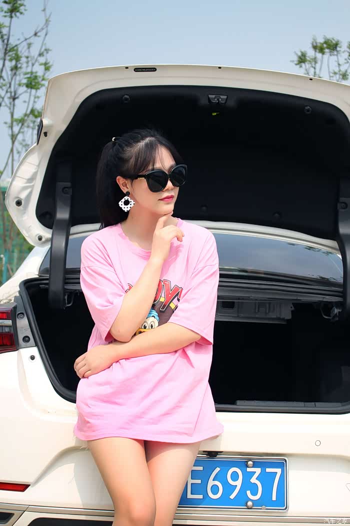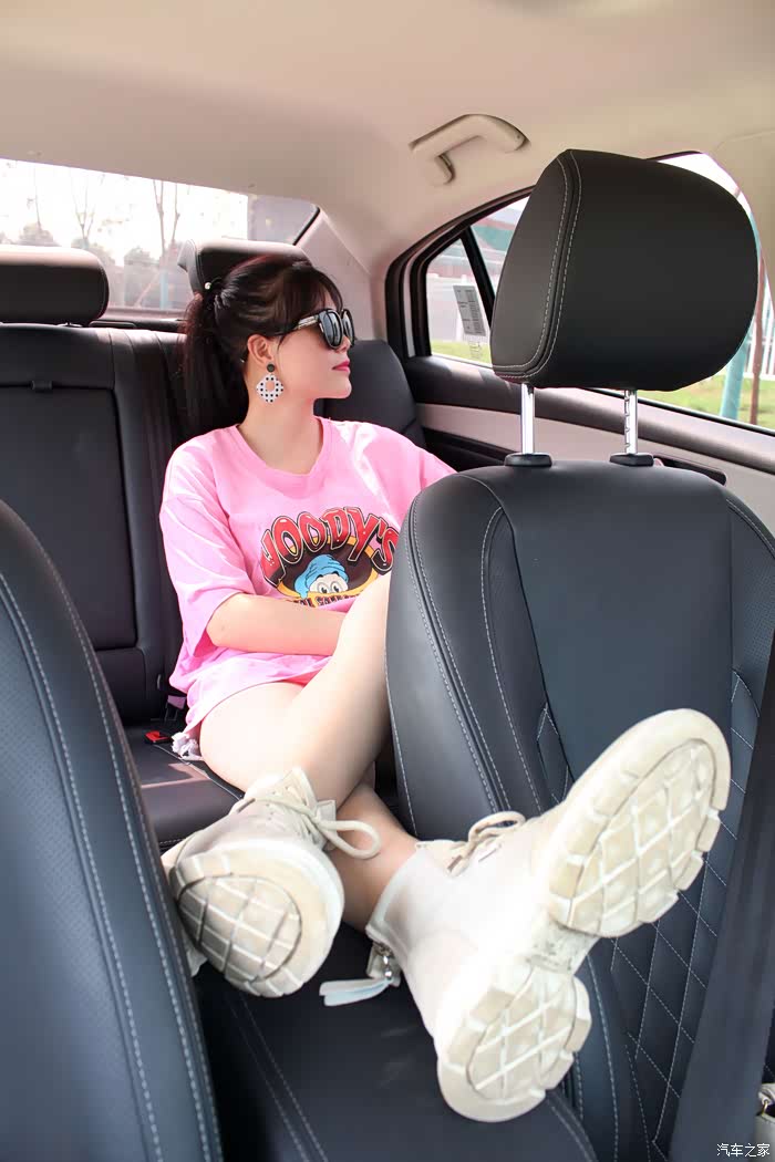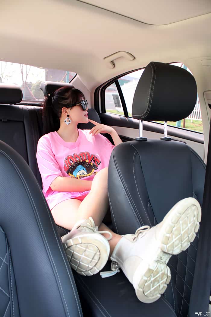 后排的空间也是足够的,美女亲自测试。这个角度看起来之所以有点紧凑,是因为前排座椅没有调控好。如果座椅调整好,后排的空间是非常不错的,翘个二郎腿啥的,OK.