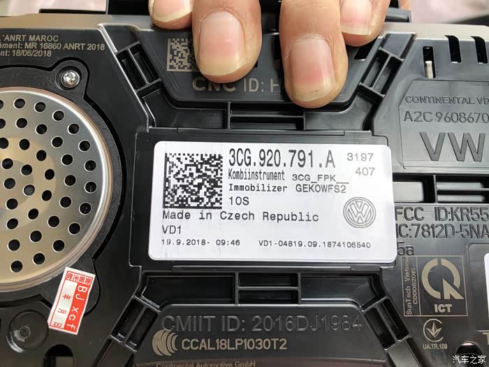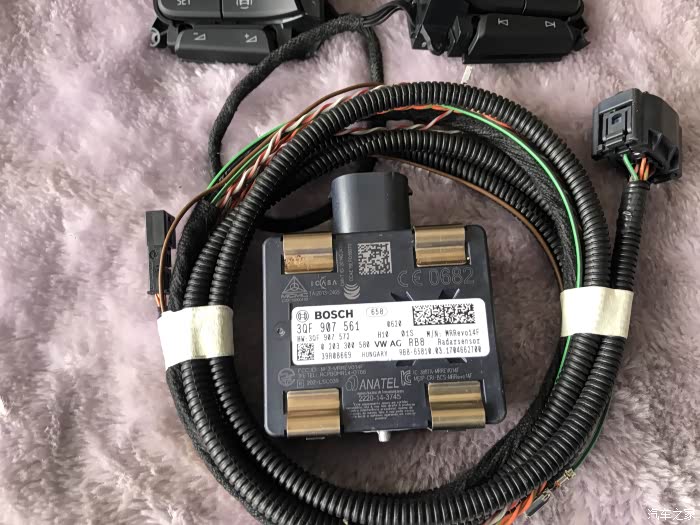 多了的这个像插片一样的东西就是转换座,在途昂X原车预留的ACC插口上,它采用了2Q0开头的ACC头,是侧插头,和3QF的头子完全不一样的角度。但是3QF在不管性能还是数据稳定性上,都是领先于2Q0的,所以既然升级就升级为好的一步到位,装上3QF的ACC。