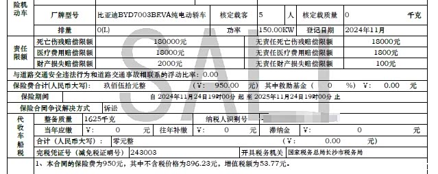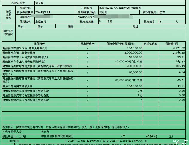 新车保险就是在4S店直接购买的,因为是贷款买的车,所以还附带了一个驾乘险。交强险950元,商业险4354.26元,驾乘险395元,保费的总价约等于5700元。