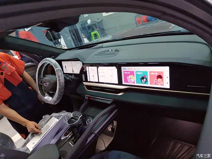 大联屏,美观,整齐,协调。第一张屏幕全亮,第二张娱乐屏减少亮度,不晃眼,不会影响驾驶者的注意力。