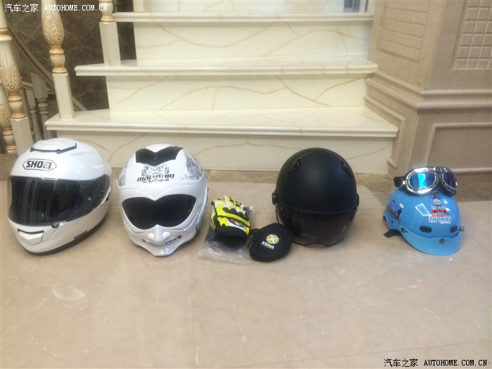 网上订的装备有:shoei日本代购的珍珠白全盔、台湾产的瑞师复古半盔、英国XENA碟锁、AGV的手套、改装的LED天使眼+红色恶魔眼+Q7透镜4300K的大灯总成、店里直接加装GPS定位。
