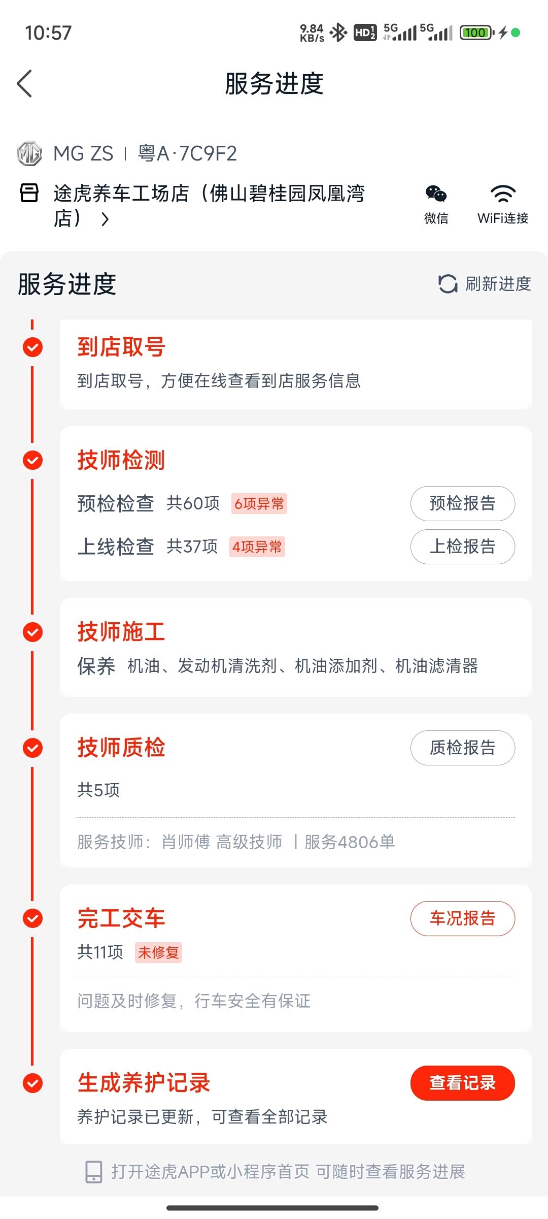 本次ZS进行的是常规保养,更换机油和机滤以及常规检查,轮胎检查,各油液检查,制动检查等项目为。车辆过保之后就开始选择性价比高一点的途虎了,主要是离家近,取送车更方便,不用耽误周末的休息时间。