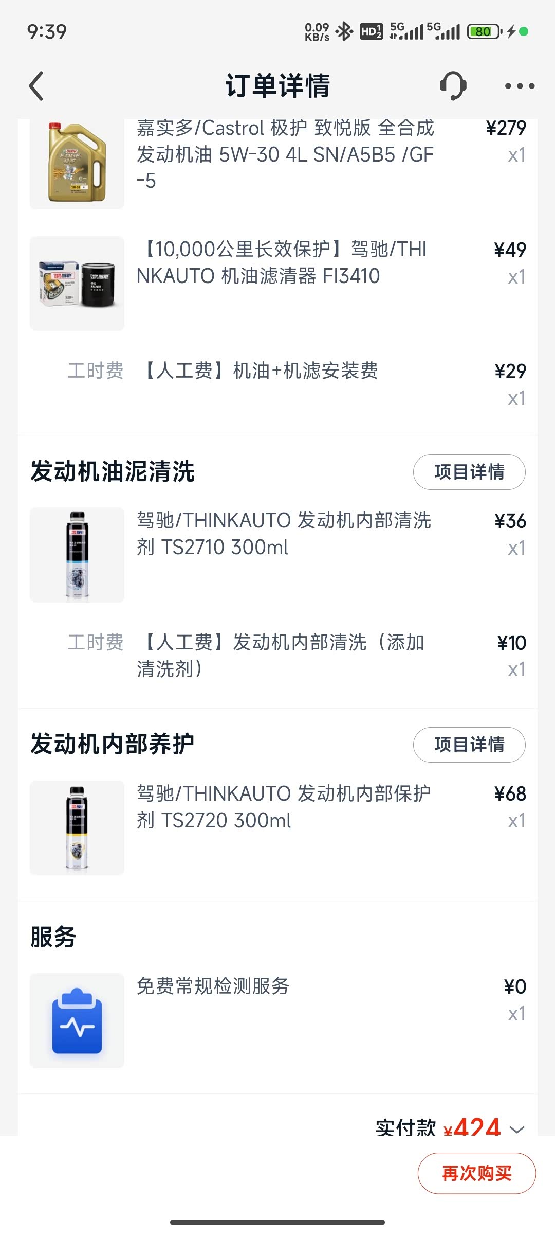 本次保养主要是机油机滤更换,顺便做了发动机油泥清洗和内部养护,含人工费共花费424,保养时间2小时。