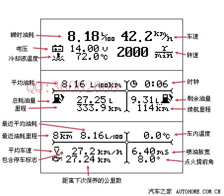 仪表上可以显示的数据很多,许多的数据可以让我们更加直观的了解车辆的信息,具体的数据显示如图: