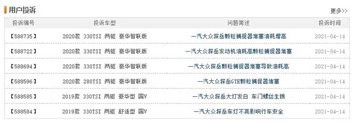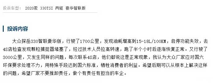 这样的事情故障投诉在一汽-大众探岳的车友群和车质网上有非常多的投诉案例,颗粒捕捉器堵塞故障相当普遍,大多车主都遭遇了油耗大幅升高,但是动力下降,自动启停失效。而且大多问题车辆都是330TSI车型,车子也都是刚提不到一年的准新车。