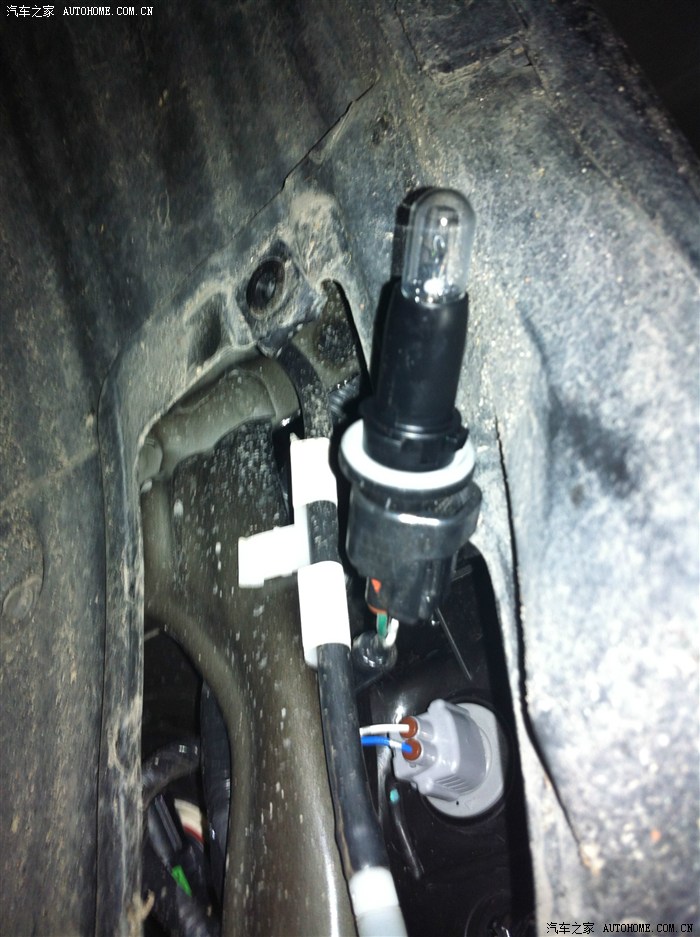 第二步,卸下灯座。用螺丝刀卸下盖板后会出现2个灯座,上方的是示宽灯,下方的是转向灯。需要把手伸进这个狭窄的空间逆时针松下灯座,如果你的手比较粗壮,可能会感觉略微有点不适:)。需要注意的是,在卸之前先看好原先的位置,一般灯座上都标有彩色线用来校准位置,以便换好新灯泡后快捷安装,下图是原车灯泡(心酸)