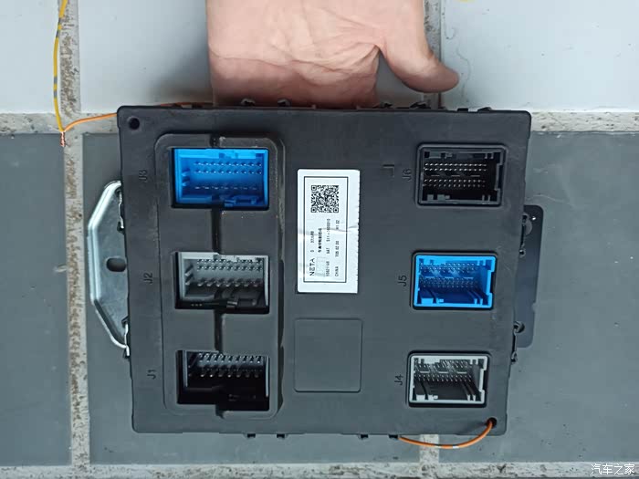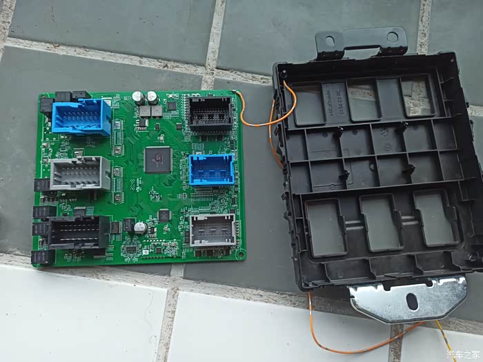 首先用频率计测试,手表钥匙这头的发射信号很强,说明手表钥匙这边没什么问题,那就怀疑是车上这边信号接收的问题了,询问了4s店师傅,得知车上bcm控制模块的位置在刹车踏板上方,略微偏左一点,找后后开拆,拆下来就是下面这个样子。