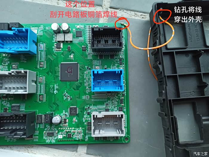 焊线位置如图所示,外壳打孔后导线穿出外壳