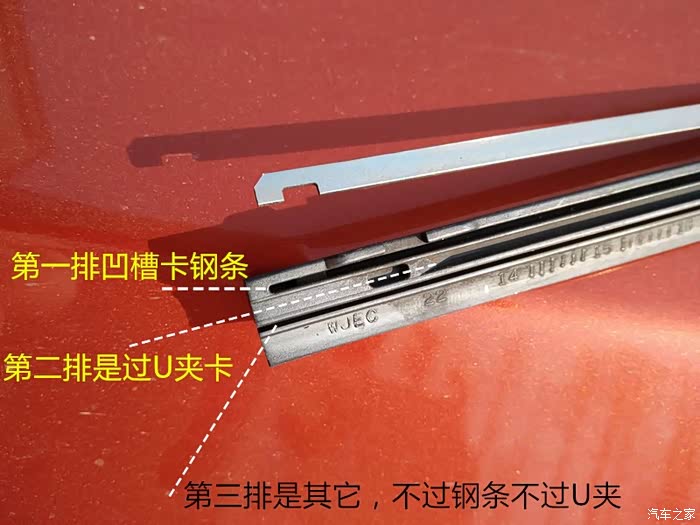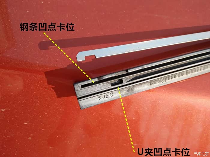 3.先观察找到U形卡夹夹在凹卡点的那一条,二个雨刷都是一样操作。