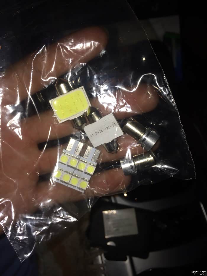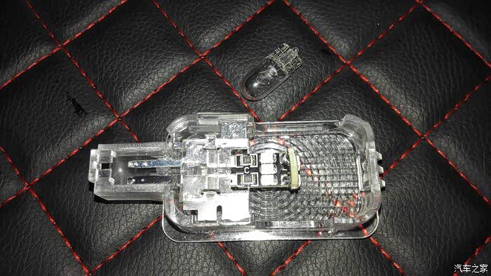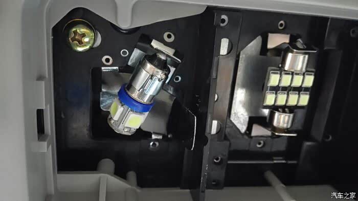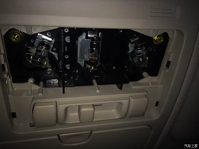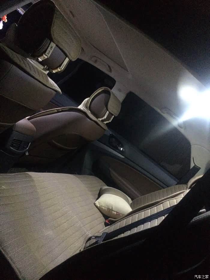 这个图是借用的。后排座位上的阅读灯,翘的时候,从开关前面翘,前面一边翘起来,然后从两边往后翘。这个灯泡拿下来,直接安上,和前排中间的灯泡差不多,很简单。