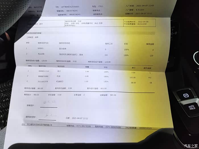 工作时间所限,不能一直陪着小灰灰做大保健,和店内小哥简单沟通,帮忙安排的很详细,介绍得很用心。首保是免费的,常规保养。(用的壳牌全合成机油)