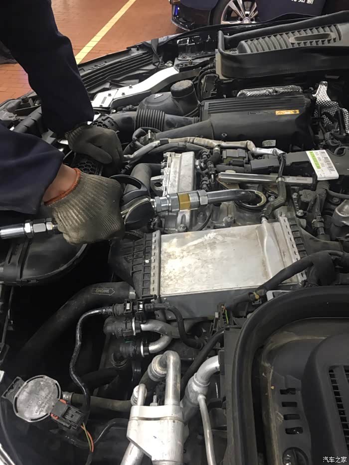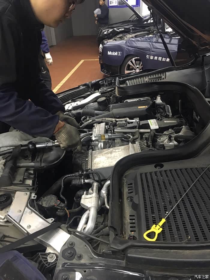 注入机油,原厂银美孚5W-40,看不到机油的品牌和包装。