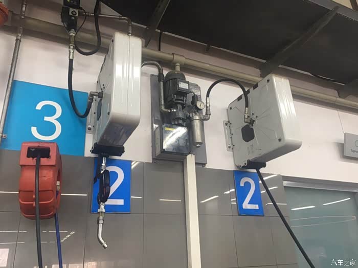 更换机油,右边的机器抽走车内机油后,左边的机器插入发动机注入新的机油,抽油用了五到十分钟吧。