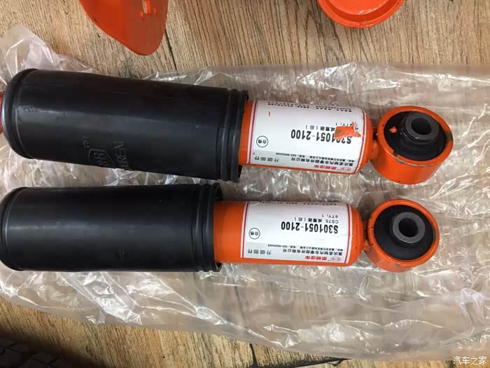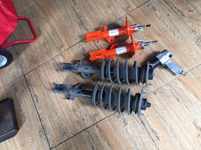 拆下的前避震器准备更换,与原装的对比,要拆下原装的弹簧换到新避震器上
