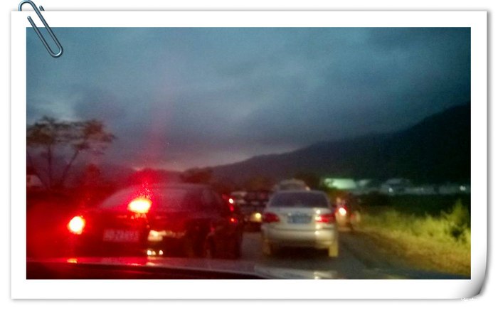 到了海棠湾,离三亚市区就20多公里了,给家里挂了电话,说6点半到家。没想到,海棠湾到三亚这一段修路封道,要绕行省道。省道一直堵车堵了近4个小时。