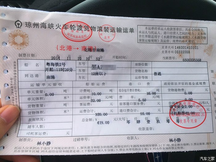 [费用]油费全程97(95)一共3030元,过路费1945元,过海419(汽车+驾驶人),乘客一位是42元。路上的收费就不说了,主要说说怎么过海。