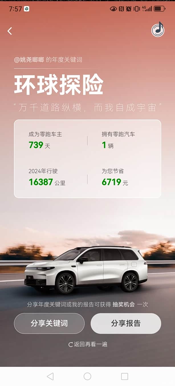 分享我的零跑C11在2024年度报告总结。我的零跑C11以日常生活通勤为主,偶尔周末或是小长假旅游,总行驶达到16000多公里。得益于零跑纯电版特点,共节省了约6719元油费。