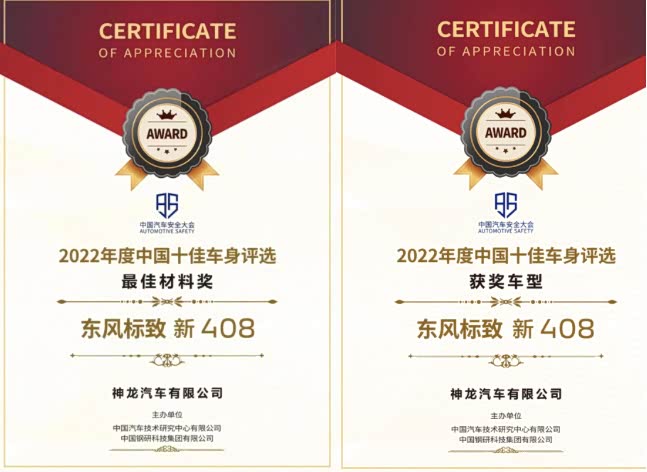 东风标致新408获“2022中国十佳车身”“最佳材料”双奖