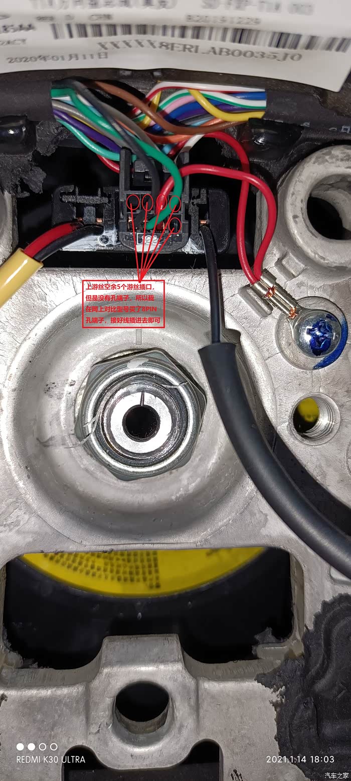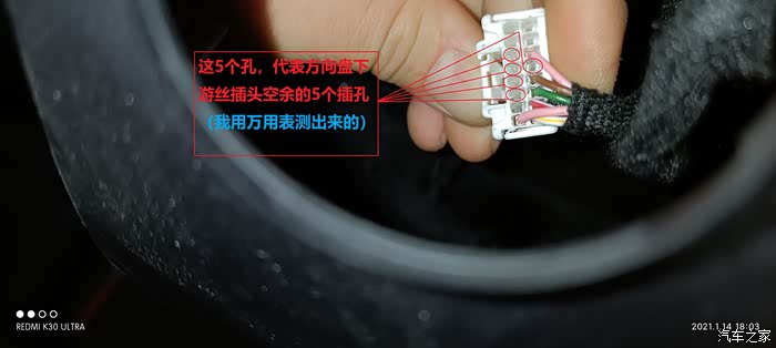 图中圈起来的就是上游丝盘插头空余插孔,其实多媒体只占用了2跟游丝线,还有一根只是搭铁而已,总共原厂就用了3跟线,还剩下5跟空余位