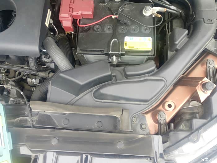 打来引擎盖,用平口螺丝刀轻轻撬开进风管两个卡子,拆掉右边一个螺丝(10个的扳手),捏住中端卡子就可以如下进风管前段!
