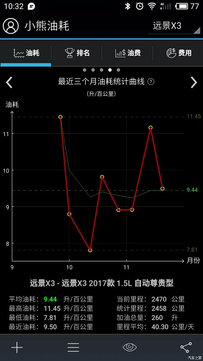 油耗! 油耗! 油耗! 一个月下来加了3次油,多一半都在市区跑,上下班比价堵,第一箱油10.63个油百公里,被吓到了,第二箱油情况有所好转9.01百公里,第三箱油7.81个百公里油耗,下面附油耗统计截图。