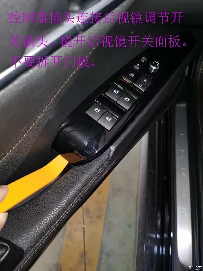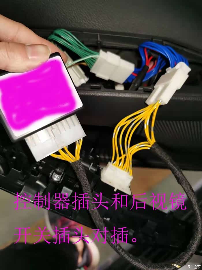 控制器插头和后视镜调节开关插头对插,不要拆门板,只要撬开后视镜开关面板就可以安装。