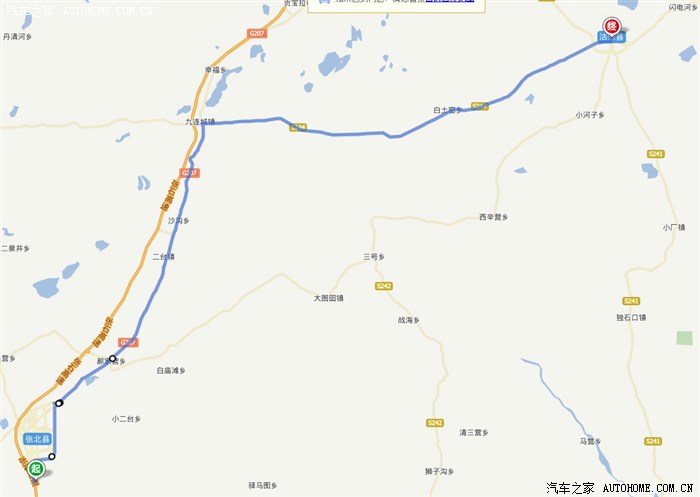 经问几个当地人,出沽源给指向了不是来时的S244而是,奔向宝昌的S241,这时导航又和行走路线反向,烦恼不堪几度关闭手机,到了宝昌导航发出正确信号上了锡张高速,然后一路奔向张北,现在看地图研究还是起初按导航走是对的直接奔向张北然后上G6,或者按当地人指导不上高速从宝昌奔向正镶白旗再走S105也是对的,可是没地图心里没底啊,就走哪是哪吧,亏了绕的也不多,经再次问人和导航选择最短路径结合,最后从张北北下走S341奔向尚义是非常明智的,强烈推荐又从沽源奔呼市的车友,即近而且是一条景色不次于草原天路的高低起伏的风车景观大道,从S341见路牌右拐尚义方向走201乡道,虽然是乡道开到150脉一点没问题,路况好景色也非常好,最后小淖尔上京藏S6高速直奔呼市。京藏限速100也不敢玩命开,有几次超速谁知有记录嘛?到了呼市下午四点左右吧