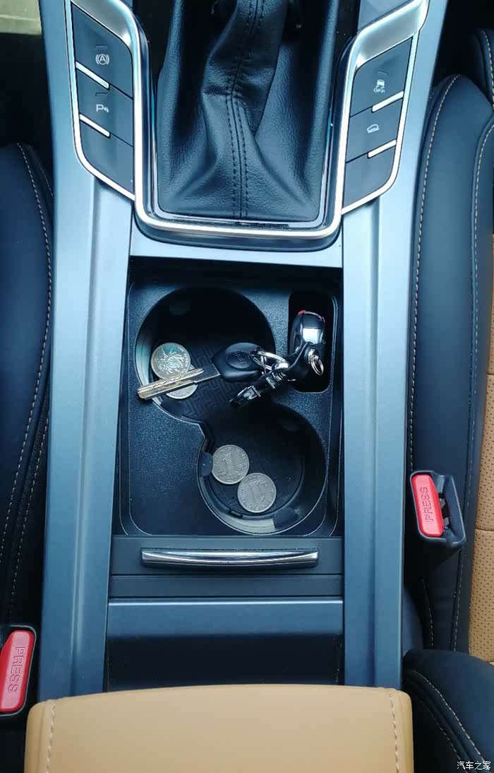 两个水杯架,旁边一个钥匙们。这里放水杯是会影响档位使用的,所以这里最好还是不放什么突出来的东西,我一般放一些零钱,上面的盖子也不拉开。看的清楚,底部是带有回纹的软的胶垫。