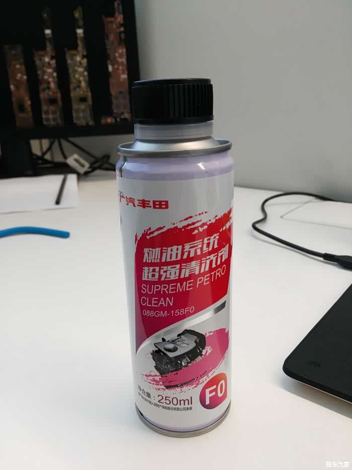 每一万公里,要换机油机滤前,最好加入一瓶燃油宝,下图是4S店第一次保养时送的,不一定非用丰田原厂的,用巴斯夫G17,美国红线,雪佛龙,只要正品燃油宝都行。这个发动机喷油嘴相对积碳较多,所以厂家建议用燃油宝,但是燃油宝是营养药,不是必须用。个人建议新车就5000公里用一瓶,保持清洁,如果旧车就别用了。