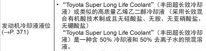 咱们原厂的防冻液是长效的,第一次16万公里换,第二次8万公里换。很多人说换防冻液要换颜色一致的,其实不对,光颜色一样不行,还要符合下图的成份要求,否则会对一些橡胶密封圈有腐蚀作用,导致防冻液渗漏。
