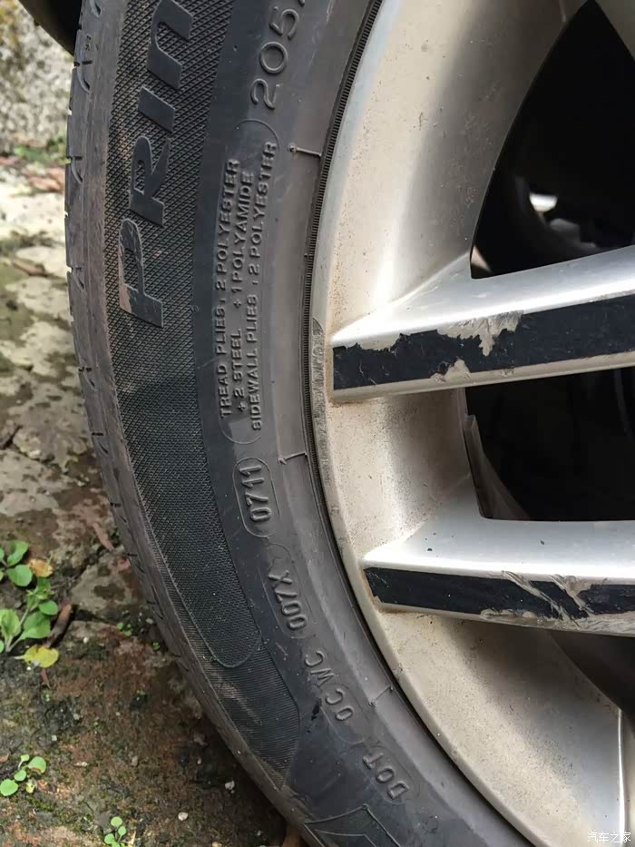前轮的LC,可以看到生产日期是0711,07代表第7周,11代表2011年,说明轮胎是2011年2月的,到现在5年半了。(请忽略惨不忍睹的轮毂,长期跑烂路,老婆说一直在当越野车用)