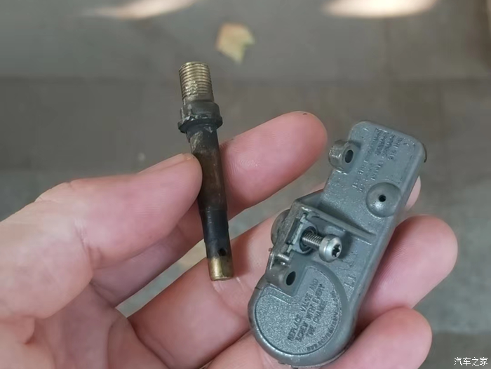 损坏的旧气嘴+旧胎压监测。左边的气嘴外层原本有一圈橡胶,在拆卸时已经割除