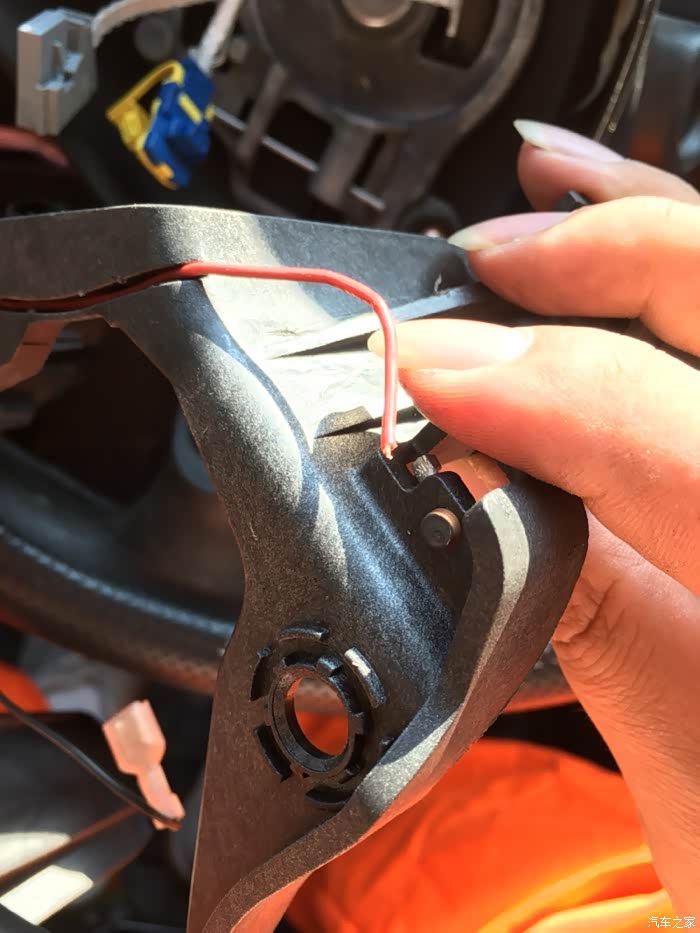 用内六角扳手水平伸进方向盘下面的小孔,一只手往里捅,另一个手扣气囊,很容易就拆下来了。