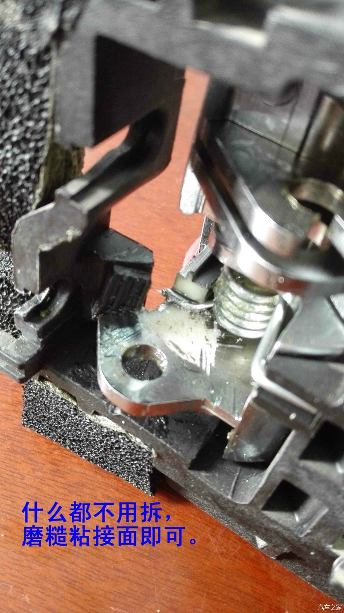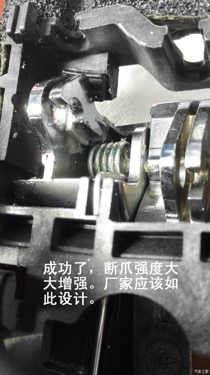 ix35右侧后门内侧拉手拉断后,连工带料换140元,这还没几天,前门副驾驶侧又拉断了,忍无可忍,自己上次看维修师傅换了一次,很简单嘛!一把螺丝刀搞定的,我找出上次换下的那套门拉手研究,发现卡钢丝头的小爪齐根断了,粘一下不就修好了吗,考虑单爪单薄易断,决定打“补强”改造,修好后一看,比原车还结实,可以说是一劳永逸。男女车主都可以照我的方法做,不用求人,自己花1个小时权当玩了,好有成就感。