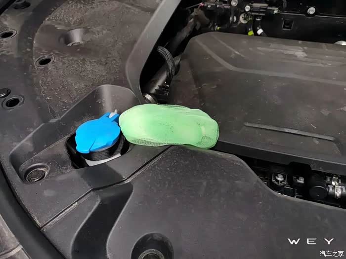 反正也便宜,并夕夕上都是几块钱,两种我都买了过来。因为不太想在里面贴胶和担心樟脑丸在塑料盒里会有异响,所以就先用上网袋,网袋也有个好处就是容量大,我一次性倒了两包樟脑丸进去,反正并夕夕上3块钱能买5包,使劲造。网袋有两层,而且蓬松能减震,能防止异响。原本打算将它挂在机舱盖的锁扣上,后来打开后发现,玻璃水壶的注水口更合适,挂好了刚好能把樟脑丸往机舱方向伸,位置完美,也不会晃来晃去,不管洗车或者下雨也不会有水能淋到它。