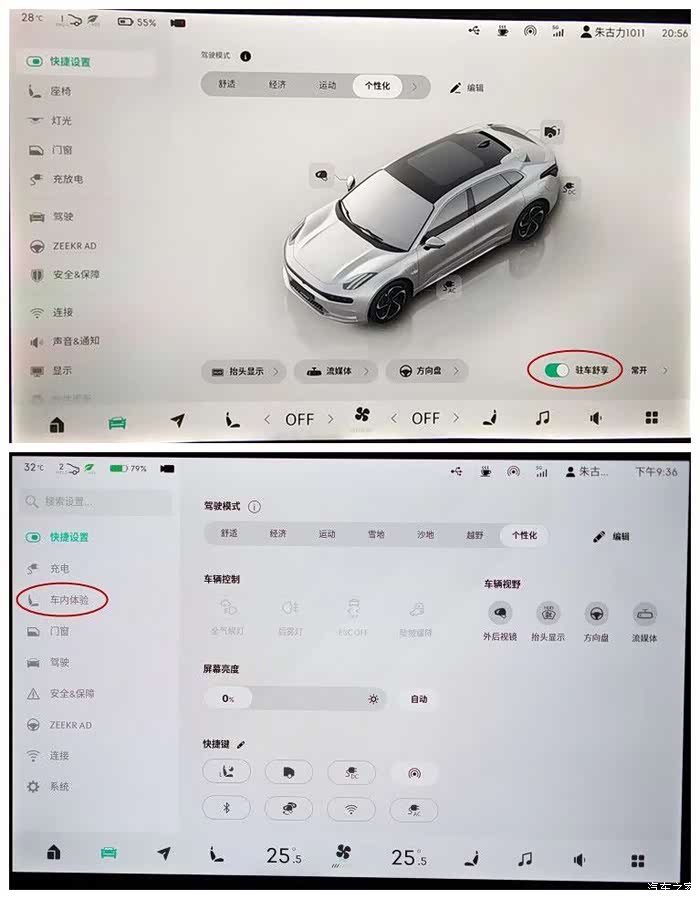 快捷设置选项卡变得更视觉化了,很多选项直接集成在车模上直观了很多点后视镜就是调教后视镜角度,点后尾箱就是尾箱的开关,之前藏在二级菜单里的驻车舒享模式现在也放在一级界面了
