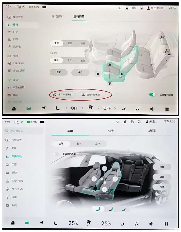 座椅调教界面变了个风格,人觉得新老界面各有特色,但新界面多了更多的可调整选项实用性更强一点,主副驾驶位一键休憩功能也放到了这个页面。