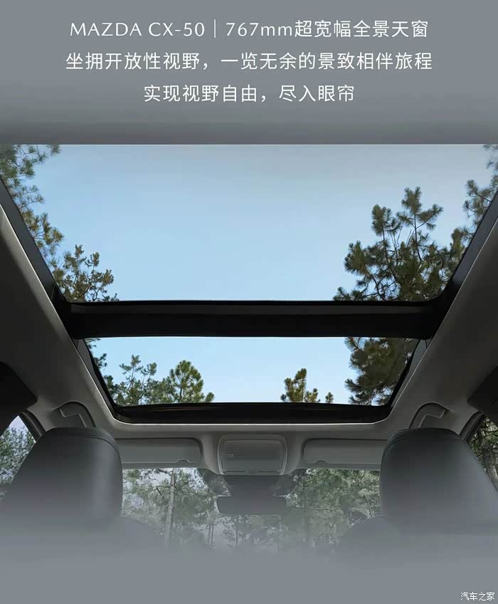 MAZDACX-50|767mm超宽幅全景天窗坐拥开放性视野,一览无余的景致相伴旅程实现视野自由,尽入眼帘