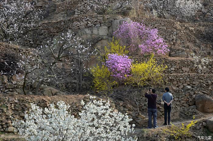 山上稍能长东西的地方,都修上了梯田,栽种了樱桃树,可见当地人之勤劳。图中可看出迎春花正在开放。