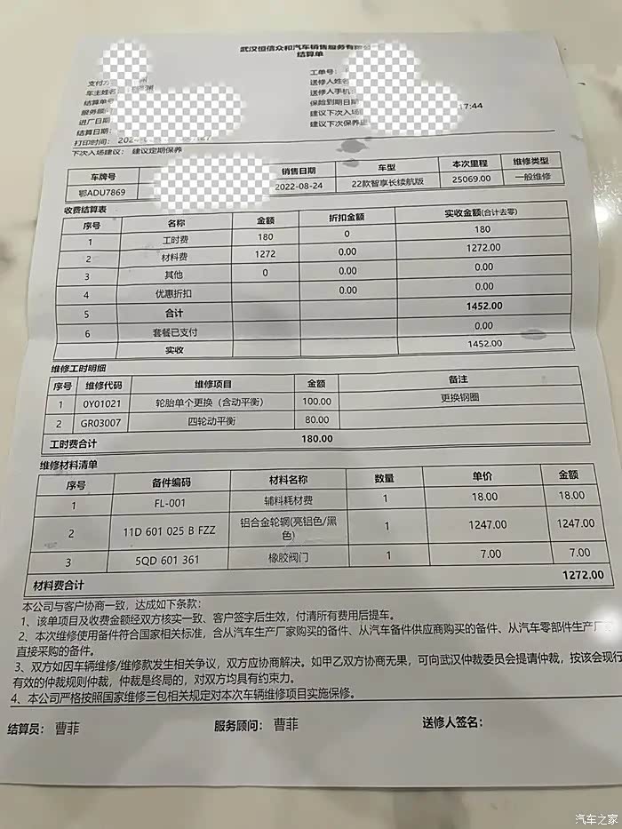 这个应该是我今年花费较多的地方,保养是去年花了1000元买的三次带空调滤芯的保养。今年4s店购买车险又赠送2次带空调滤芯的保养。保养上我的花费是0元。但是今年的我的右边前轮和后轮的轮毂都在4s店进行了更换,前轮是1450元,后轮因为有抽到4s的200元保养劵,最后花费了1160元。一共花费了2610元。