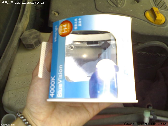 觉得风华原车的大灯灯泡亮度不够,在黑暗的路段很难看清路面(顺带一提,原来风华原车使用的灯泡是欧司朗的)。于是近日跑去一洗车店换了一对飞利浦蓝战士灯泡(蓝色涂层),花了140元,赠送一次洗车。如在网上买连运费安装费什么的算下来也跟这个价钱差不多了,所以去实体店买更方便、快捷、实在一点。灯泡的规格为:H4,12V /55W,4000K黄白光。按装后效果非常好,蓝色涂层的灯泡发出白色的光芒。在晚上行车时,蓝战士输出如同日光效果的光线。