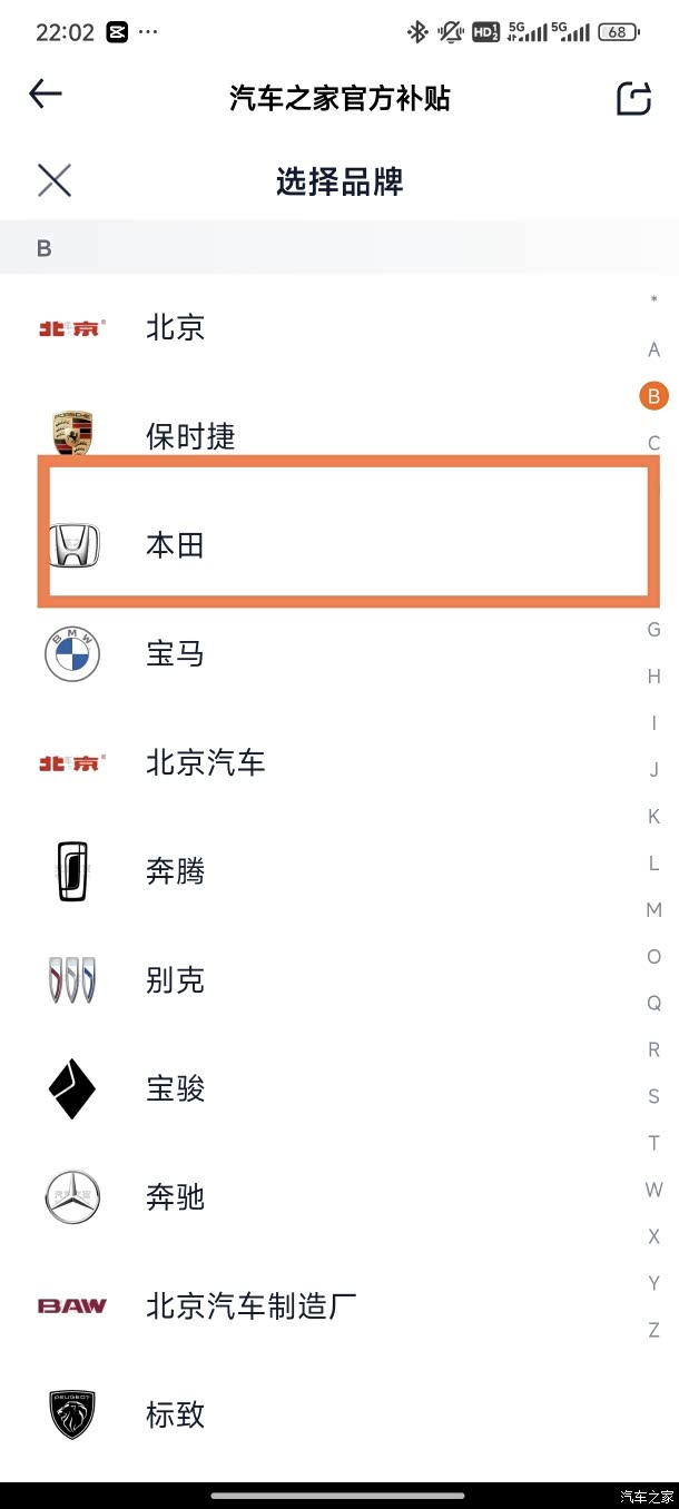 第四步,找到本田汽车品牌。