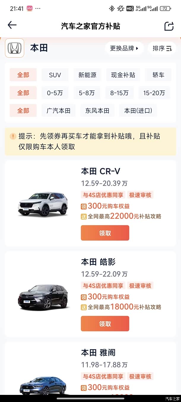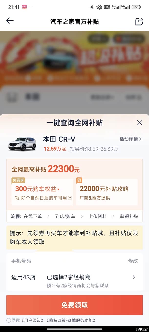 汽车之家买车补贴:300元购车权益补贴(必须在购车、订车前领取,已经下定的再领取无效哦),别看钱少,那也是白捡,跟门店和其他补贴政策不冲突。