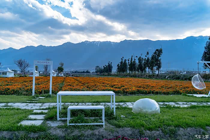 沿着洱海路环游洱海时,会看到很多花海。所谓花海就是一处处圈起来的小农场,里面种满了各种各样色彩斑斓的鲜花,我猜这些农场一年四季应该都是鲜花盛开的样子。据我观察这些农场的鲜花并不是用来销售的,似乎只有一个功能,那就是——拍照。因为花海里面有各式各样的那种网红拍照道具,比如透明球、白色桌椅、天空之境等等。我们离开崇圣三塔和大理古城后就前往我们预定的客栈入住,在去客栈的路上看到一处规模比较大而且花开的不错的花海,我家虫虫就想去这个花海看看,本来我是想找一个以洱海为背景的花海去拍照的,但因为这个花海离客栈很近,而且虫虫喜欢,我们就去了这个花海,没想到在这个花海却看到了令人难忘的景色: