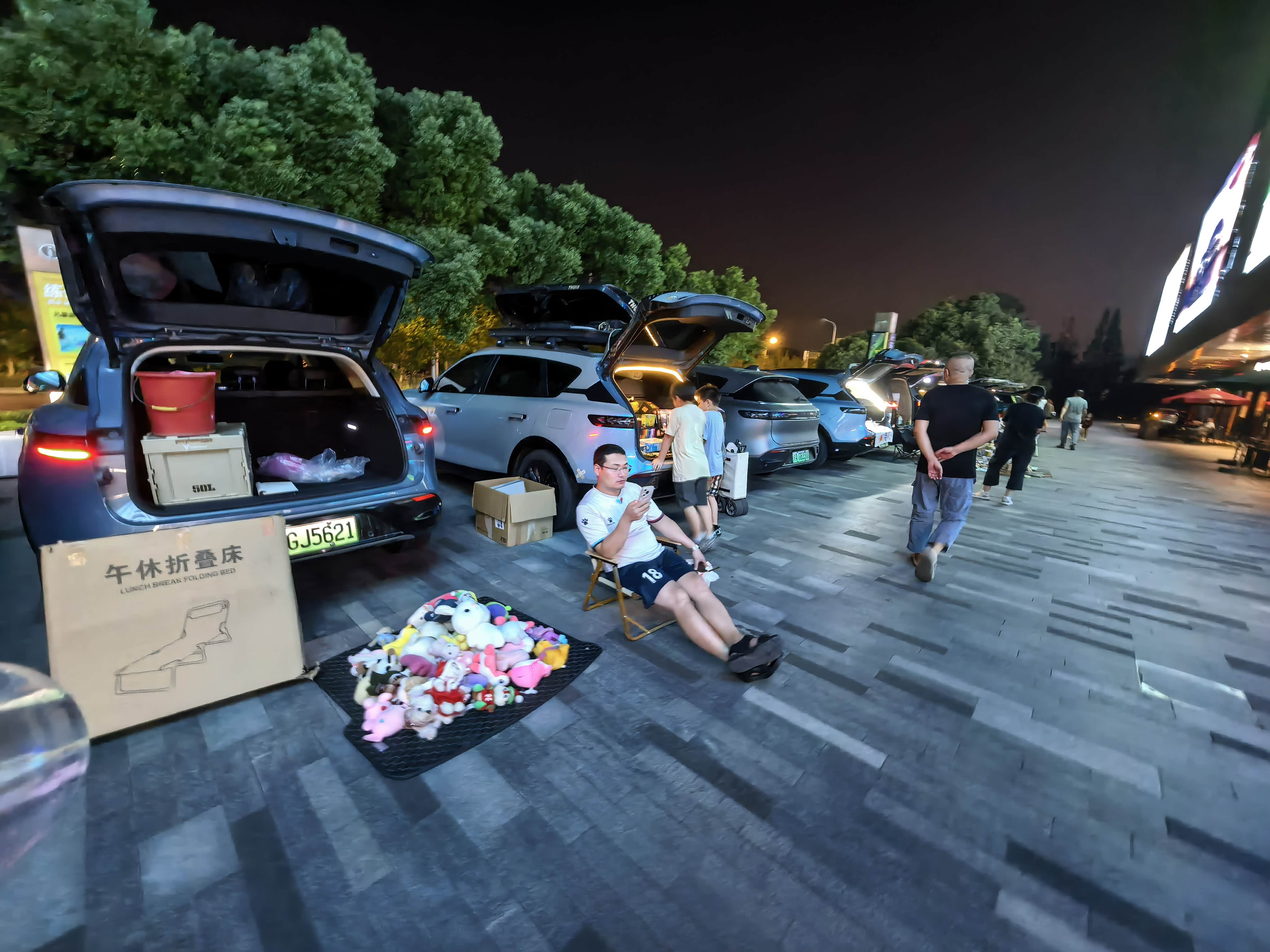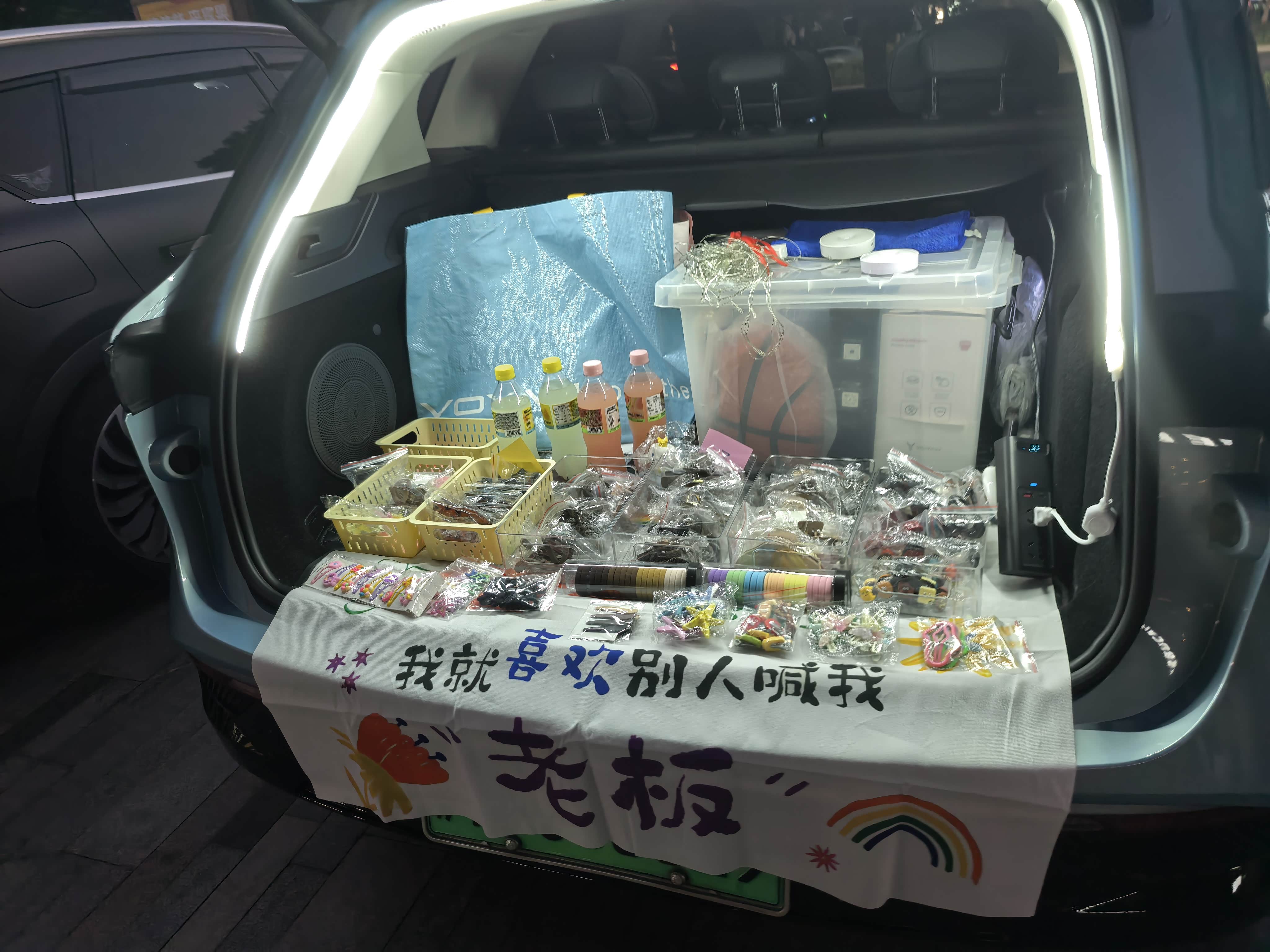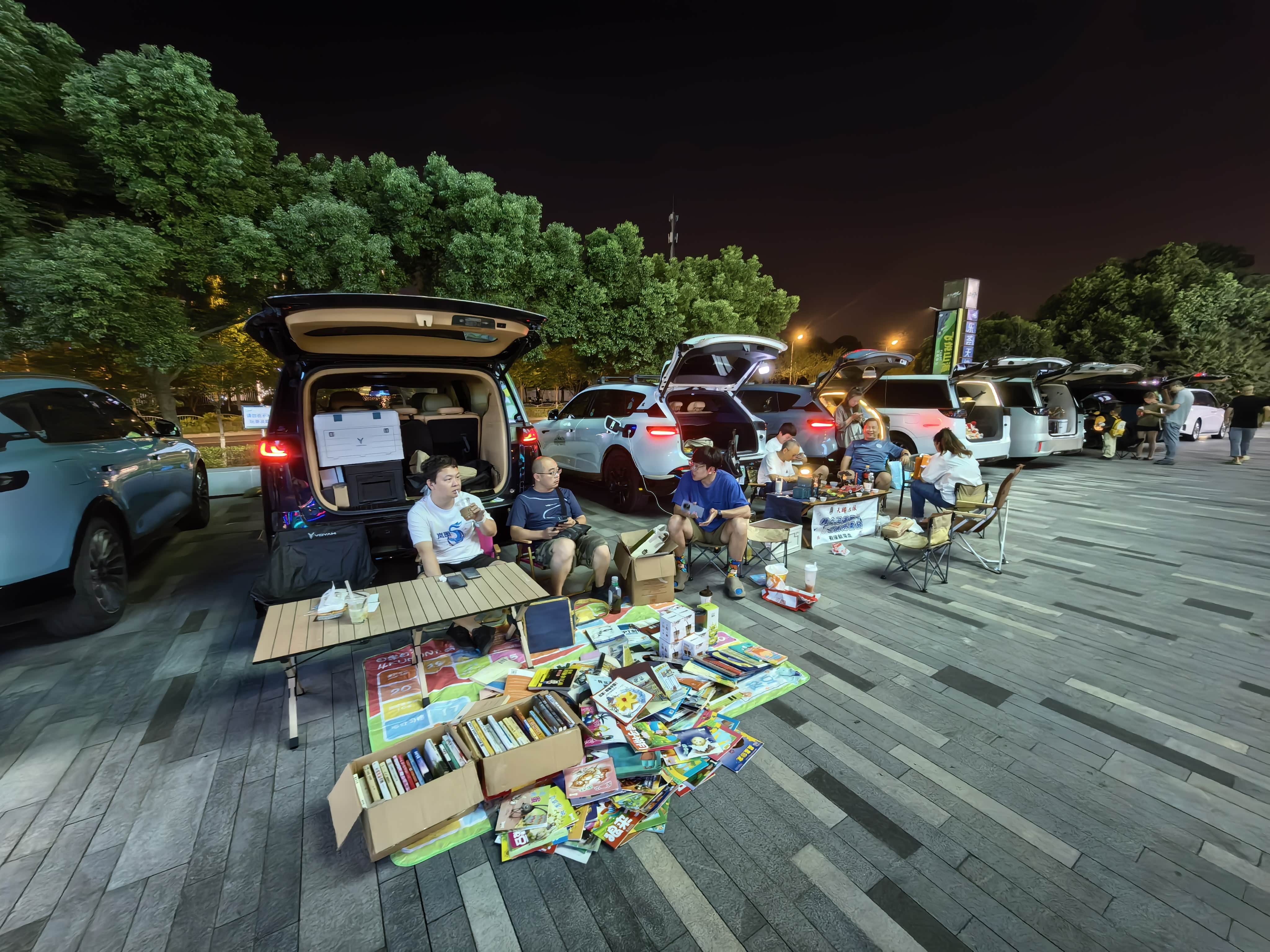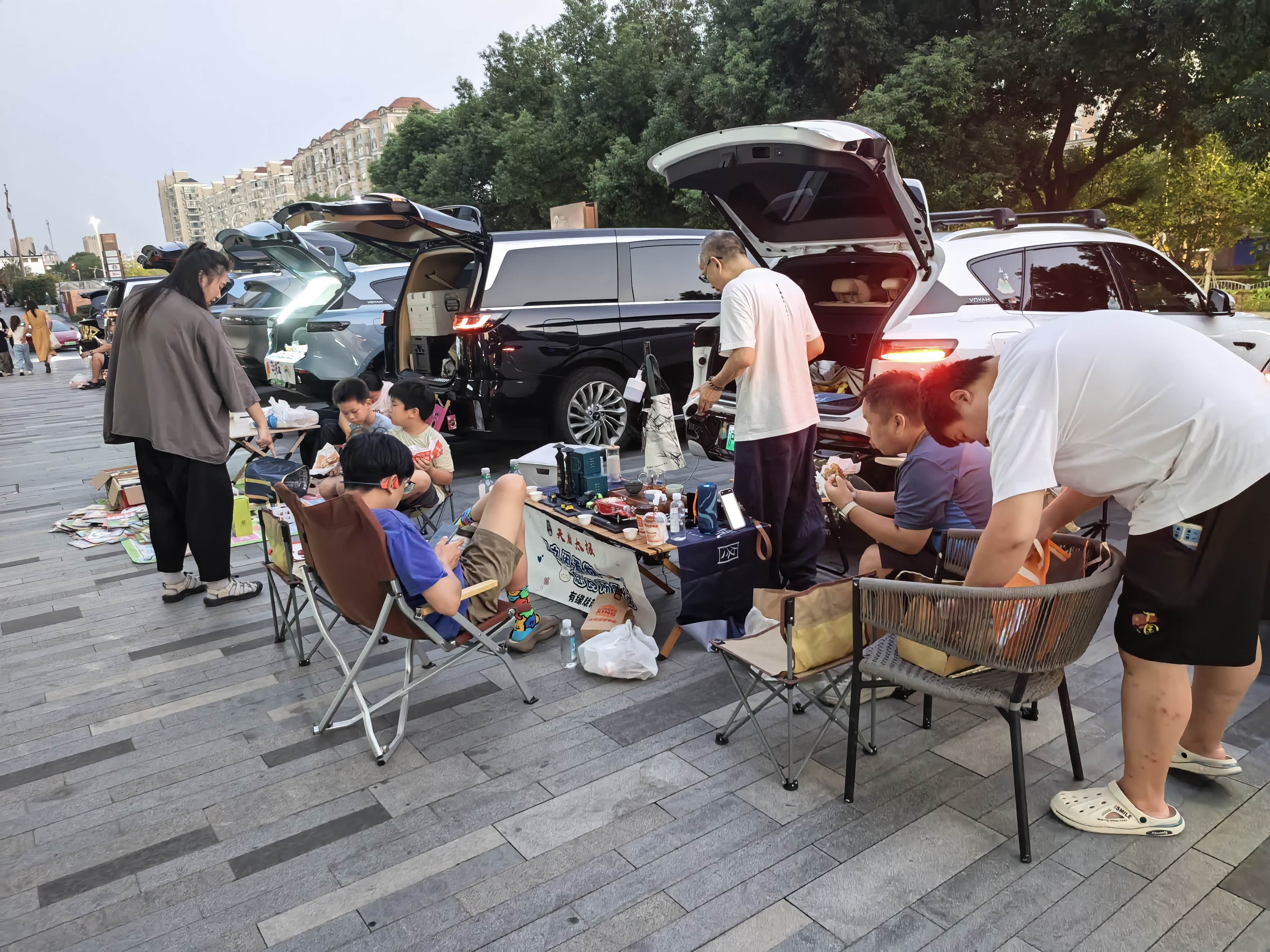 到了晚上七点多天慢慢黑了,商场灯光亮起来,集市氛围更浓了。有车友带了小音箱放轻快的歌,还有人拿零食出来分,我也把儿子爱吃的饼干跟旁边大姐分享。虽然我这边剩下的东西还不少,但一点都不着急,这种不图赚钱、只图凑个热闹做件好事的氛围,比单纯带娃逛街有意思多了。